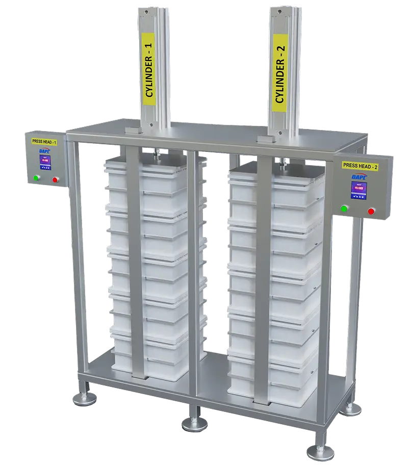 DAPL’s Vertical Pressing System is designed for uniform and controlled cheese pressing using a progressive pressure application. The setup allows multiple piston heads, each capable of pressing up to 10 moulds (depend-ing on mould size), delivering consistent and repeatable results.