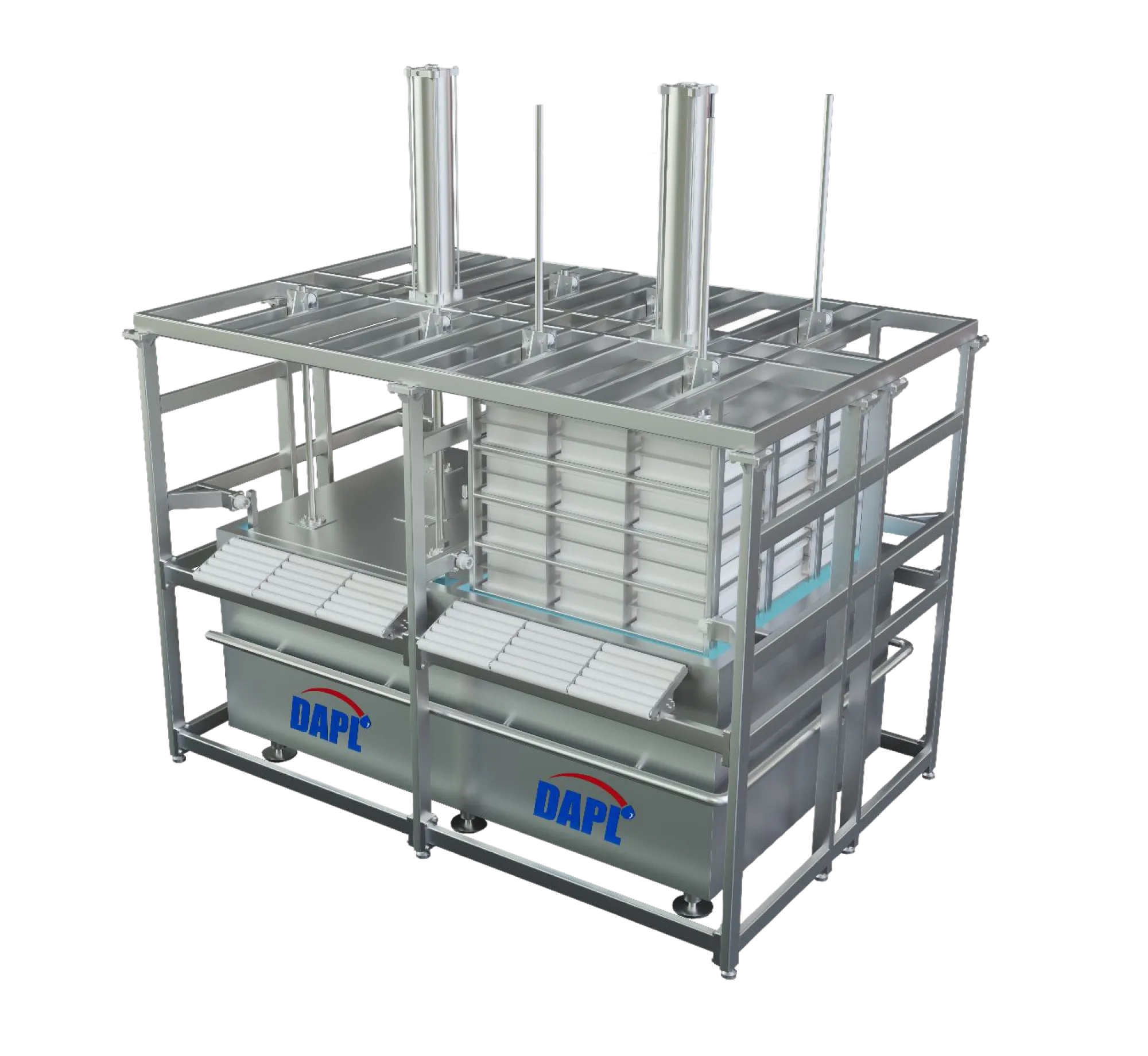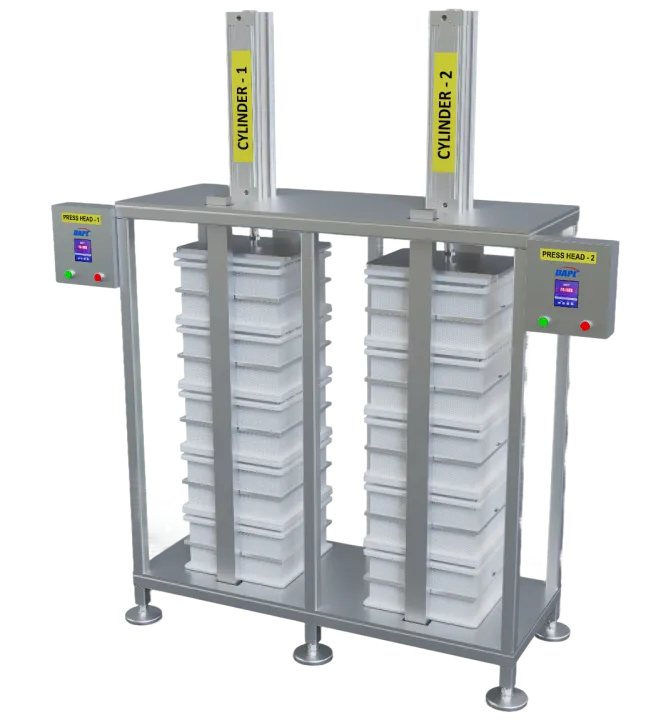 DAPL’s Vertical Pressing System is designed for uniform and controlled cheese pressing using a progressive pressure application. The setup allows multiple piston heads, each capable of pressing up to 10 moulds (depending on mould size), delivering consistent and repeatable results.